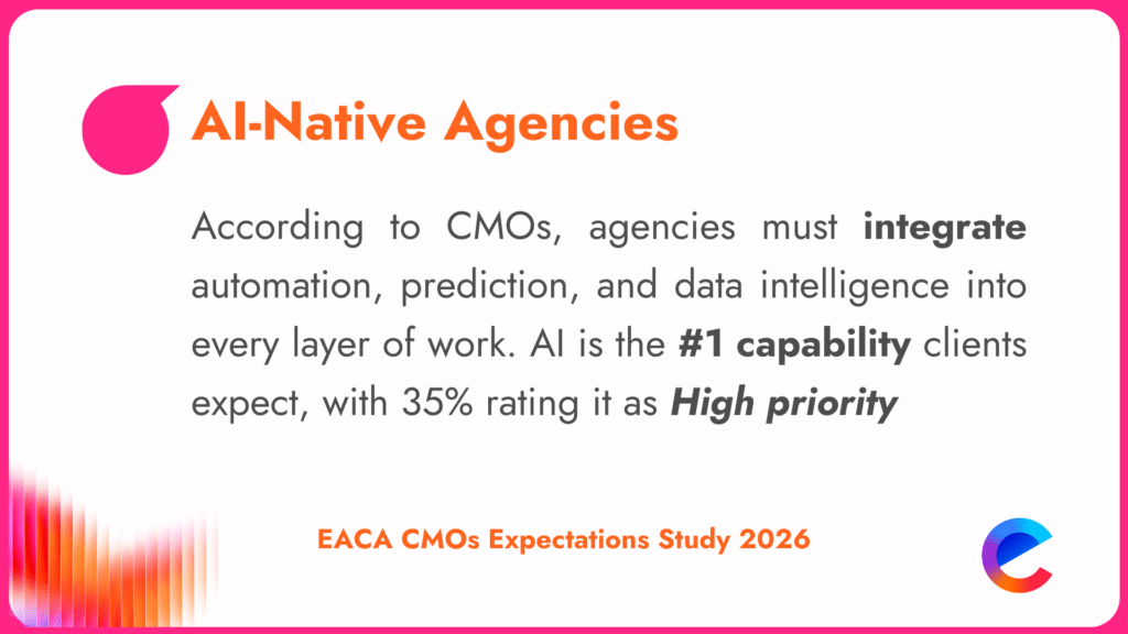 Le rapport dessine un profil d’agence précis : intégrée aux équipes client, stratégiquement solide, opérationnellement irréprochable, créativement pertinente et capable d’intégrer l’IA sans perdre son intelligence humaine. Plus qu’une évolution progressive, les CMOs parlent d’un changement de modèle.
